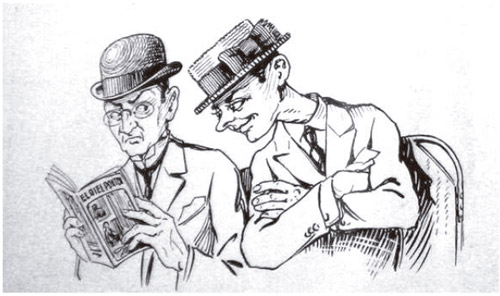 Los modales que debía ejercer un pasajero eran diversos y provenían de diferentes voces. Luego de varias décadas de funcionamiento del tranvía, la mayor empresa de transporte de la ciudad, la CAAT, lanza en 1925 una revista (a cinco centavos, la mitad del precio de un boleto) para sus usuarios en la cual, con diversos géneros discursivos, como el cuento, el humor gráfico y anuncios sobre seguridad, difundía normas de comportamiento. A través del humor, por ejemplo, satirizaba a “personajes” y señalaba comportamientos que deberían evitarse. En una columna titulada “Desde la plataforma”, se criticaba a través de caricaturas y textos al “señor que silba”, al “señor que lee de ‘ojito’” (figura 1), “el señor que no se sienta” parándose en la puerta del tranvía como formas de comportamiento que incomodaban al resto de los pasajeros. En un tono similar, la revista Mundo Moderno publica en noviembre de 1928 una serie de “galerías” fotográficas de “mal educados”, en las que aparece “el hombre que golpea a todo el mundo con el bastón”, representado por un pasajero vestido de frac y con galera que al sacar un boleto en el subte golpea con su bastón (que lleva bajo su brazo) a la pasajera que espera detrás en la fila. También se ilustraba a un hombre, de vestimenta más modesta que el caso anterior, “que se limpia las uñas en el tranvía o el ómnibus” ofreciendo un “grosero espectáculo” especialmente cuando van sentados “junto a una mujer, que tiene que sufrir su indelicadeza”.11
