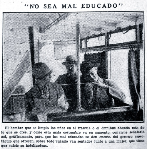 Entre los discursos que circulaban sobre las experiencias en el transporte público de Buenos Aires, existían aquellos que daban cuenta de que un sujeto metropolitano era aquél que tenía las habilidades y destrezas para utilizar los medios de transporte; las instrucciones de cómo utilizar los diferentes medios de transporte son un ejemplo explícito. Pero existían otros discursos que daban cuenta de una forma “civilizada” de ser un pasajero moderno, centrada en los modales, la compostura, la educación o urbanidad de los sujetos. Estos códigos de urbanidad iban desde la cortesía de ceder el asiento a una pasajera a no fumar en un vehículo, del aseo al trato respetuoso hacia el otro. Es decir que si una característica de las grandes urbes, apuntada por teorías sociológicas, es la de mantener la distancia social en la proximidad física, aquella distancia exige ciertos “esfuerzos” —como evitar el contacto visual con otro pasajero por un tiempo prolongado— y formas de interacción social normadas explícita o implícitamente (Goffman, 1963). Es decir, para que fuesen posibles la amabilidad, la cortesía o la “caballerosidad”, etc., lejos de mantener distancia o recluirse en uno mismo, era imprescindible actuar de determinada manera. Y es a estas formas de actuación a las que apuntaban la mayoría de los discursos que analizaremos.