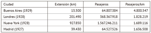 Cuadro comparativo de extensión de redes de subterráneos y número de pasajeros en cuatro grandes ciudades