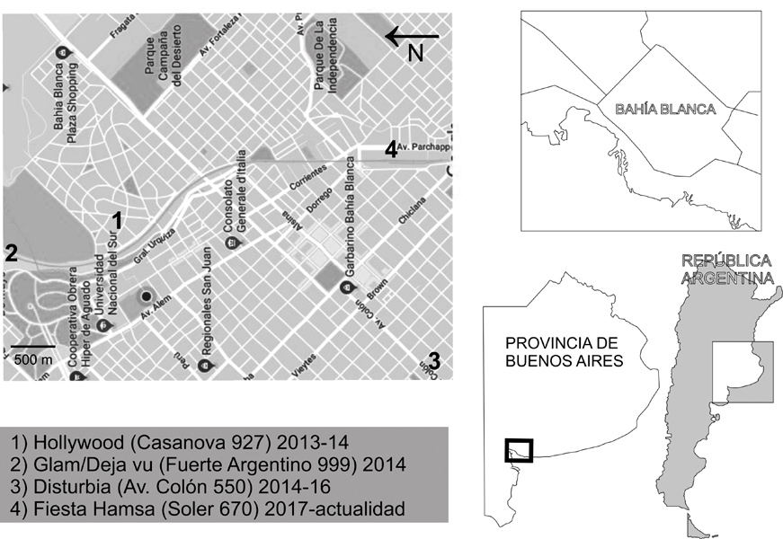 La investigación exploratoria responde a un enfoque cualitativo, basado en entrevistas abiertas a un total de diez sujetos autodefinidos gais de diverso rango etario, y la observación participante, sustanciada en espacios y escenarios diversos como plazas y parques, “previas”2, fiestas y aplicaciones de citas. Dichas fuentes estuvieron mediadas por una fuerte implicación (Blanco, 2014), ya que la obtención de los testimonios requirió complicidad y confianza. Como consecuencia, el estudio repara en una actitud comprensiva y comprometida de la geografía social (Herin, 2006) tomando como insumo las valoraciones que describen vivencias en Bahía Blanca (figura 1). Conocer el espacio vivido a escala urbana, el peso de las representaciones y sus itinerarios resultantes constituye el principal objetivo de la investigación. En este sentido, desandar los meandros espaciales de sujetos identificados como gais en función de sus percepciones apalabradas es, de algún modo, apropiarnos de sus experiencias.