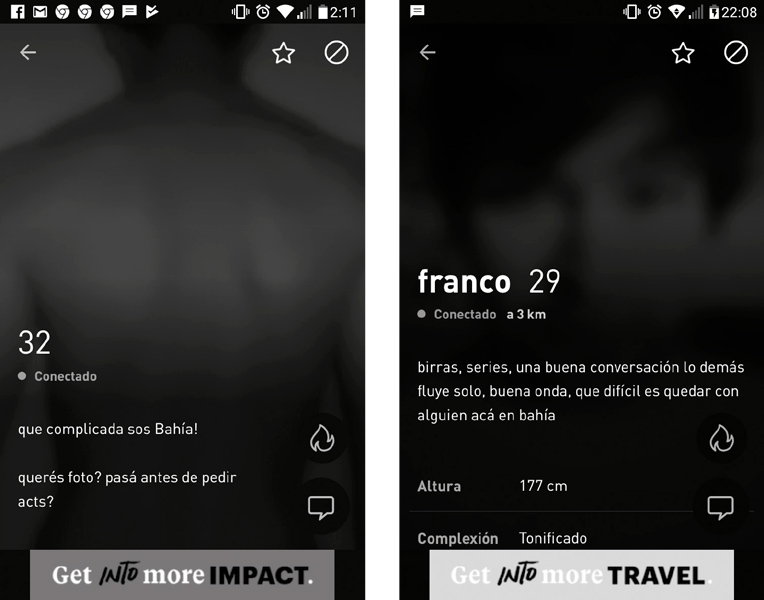 A través de las entrevistas y el análisis de imágenes (figura 3) aparecen diálogos que fortalecen la idea de un clóset virtual: “si querés foto, pasá antes de pedir”; “si vos me hablaste primero, tenés que mandar vos”, “yo me pongo en discreto (en relación al casillero tribus), como la mayoría de esta ciudad”. Esta ida y vuelta intrincada produce estrés y malestar en la dilatación del encuentro21, que sólo asegura la sucesión de los “bit vip”22. Finalmente, el sentimiento es frustrante: “qué difícil es quedar con alguien acá en Bahía”.