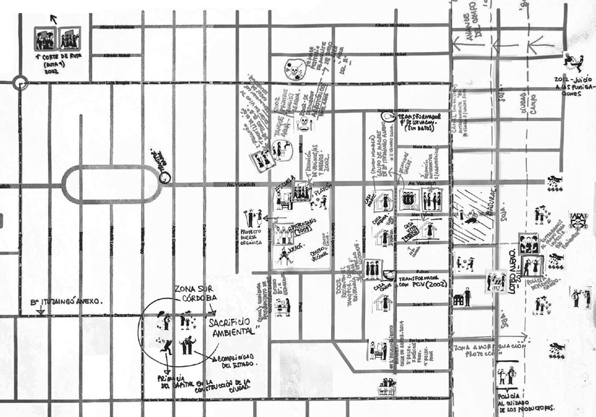 A partir de la trayectoria del Grupo de Madres de B.º Ituzaingó Anexo en su articulación con procesos de investigación, tomamos como referencia los antecedentes de Berger y Carrizo (2016: 131), quienes plantean la necesidad de comprender la “práctica de investigación como la cooperación dentro de una comunidad de acción a un sentido de justicia compartido”, entendiendo desde una mirada amplia que los conflictos abordados en la investigación afectan a la sociedad en su conjunto, incluyendo a los/as investigadores/as. Como herramienta de trabajo para esta metodología usamos el mapeo colectivo, siguiendo a Risler y Ares en su trabajo como iconoclasistas, quienes plantean el proceso del mapeo como una instancia de creación que “subvierte el lugar de enunciación para desafiar los relatos dominantes sobre los territorios, a partir de los saberes y experiencias cotidianas de los participantes” (Risler y Ares, 2013: 14). Pensar este tipo de mapas como soporte para reconstruir la historia habilita la emergencia de nuevos relatos territoriales. Deleuze y Guattari dicen que “el mapa no reproduce un inconsciente cerrado sobre sí mismo, lo construye” (Deleuze y Guattari, 1997: 18). Estos autores vinculan la construcción de mapas con un momento de agenciamiento. El uso de este tipo de herramientas gráficas acompaña a las propuestas metodológicas que proponen la participación en la investigación e incorporan recursos visuales que amplían las formas de comprender y reflexionar la realidad cotidiana, histórica, subjetiva y colectiva.