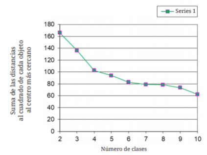 Diagrama de Elbow donde se observa la suma de las distancias al cuadrado de cada punto al centroide de su clase, en función del número de clases.