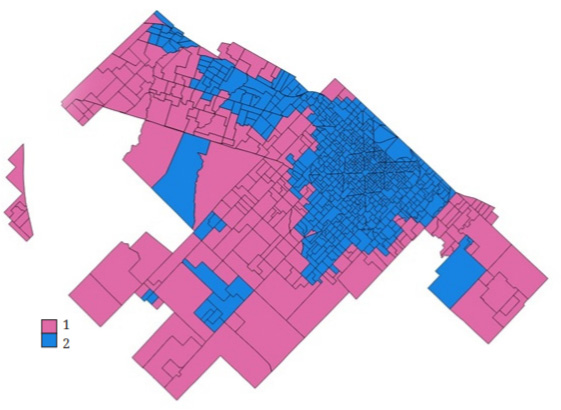 Fuente: elaboración propia.Como se puede observar en la figura 1, los radios censales de una misma clase tienen el mismo color. Por lo tanto, el mapa de la figura 1 muestra el resultado obtenido al considerar dos clases distintas; mientras que el mapa de la figura 1.1. muestra lo que acontece al agregar una tercera clase.