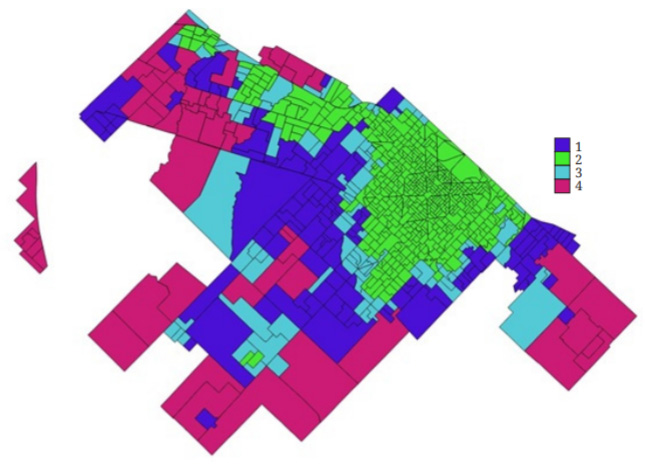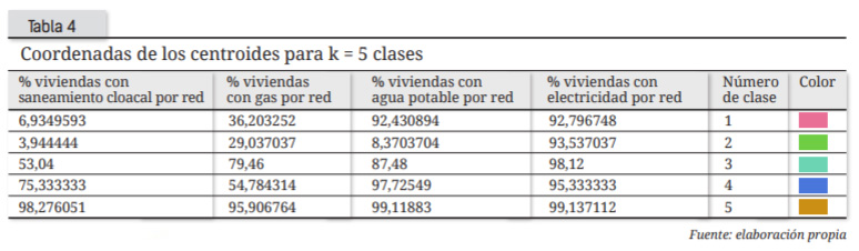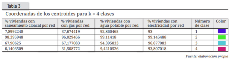 De esta manera, el análisis permite identificar, agrupar y localizar con precisión las áreas urbanas con similares características, visibilizando vacancias en los porcentuales de cada cobertura y sus diferentes combinaciones. Dado que cada radio censal es representado como un vector 4-dimensional y se asociará al centroide más cercano, es decir, a aquel centroide que aplicando la fórmula de la distancia euclídea n-dimensional esté a menor distancia, es de esperar que los valores de cada coordenada de un radio censal estén “cerca” del valor que tiene, en esa misma coordenada, el centroide más cercano.