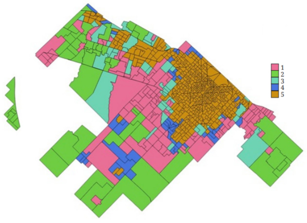 Fuente: elaboración propiaAl considerar cinco clases (figura 2.1.), el casco urbano (clase 5) sigue manteniendo una alta cobertura en cada uno de los servicios y conservando homogeneidad espacial, en tanto que algunos de los sectores restantes presentan ciertos grados de fragmentación.