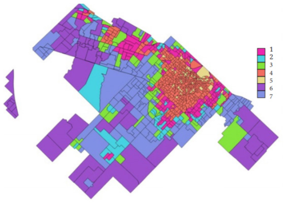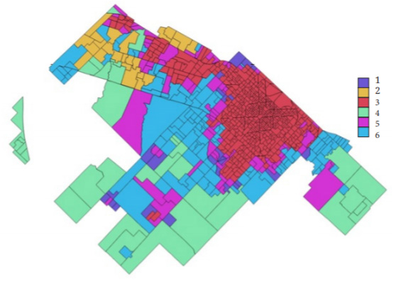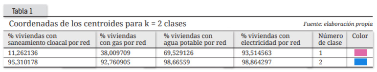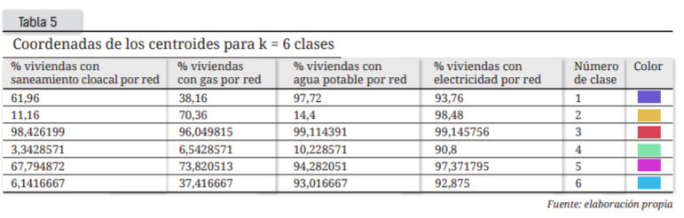 En cuanto a los resultados obtenidos al aplicar el algoritmo de agrupamiento, puede decirse que si bien el diagrama de Elbow brinda información valiosa en relación con la distancia promedio de los puntos a su correspondiente centroide, el número K de clases “ideal”, en realidad, dependerá del tipo de resultado que se busca. Así, por ejemplo, si K es igual al número de elementos para clasificar, cada clase tendrá un solo elemento y la distancia promedio al centroide será 0. Sin embargo, por más deseable que sea esta última característica, el resultado que se obtendría sería el mismo que si no se realizara ninguna clasificación. Asimismo, si el número de clases que encontrar fuese igual a 1, entonces todos los elementos formarían parte de la misma (y única) clase, por lo que la clasificación no tendría ningún sentido. Por lo tanto, el número de clases K deberá ser estrictamente mayor a 1 y menor a la cantidad de elementos para clasificar. En esta instancia, será el especialista en el dominio del problema quien determine (justificadamente) la cantidad “correcta” de clases en las que se pueden agrupar los elementos para clasificar. En este trabajo, el resultado obtenido para k = 6 es considerado el ideal para el caso de estudio, pues se trata de un número razonable de grupos homogéneos y que además presentan continuidad espacial. Las coordenadas de los centroides de cada una de las seis clases describen un porcentaje de cobertura de cada servicio, y cada radio censal se asigna al centroide más cercano.