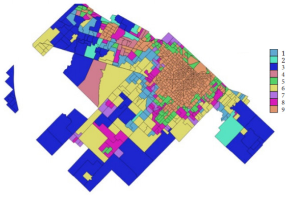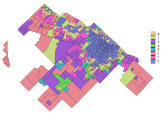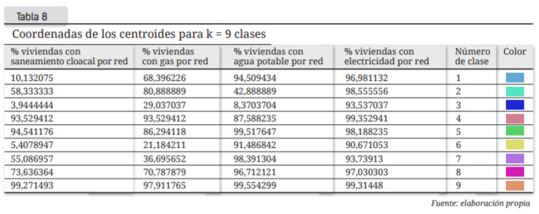 Fuente: elaboración propiaEn el agrupamiento con ocho o nueve clases (tablas 7 y 8) se observa que la homogeneización del casco urbano se debe a que el centroide de la clase 8 de la tabla 7 es próximo al de la clase 9 de la tabla 8, puesto que en ambos casos representan la parte urbana consolidada, de manera similar a cuando se consideraban seis clases, pero aumenta nuevamente la fragmentación (heterogeneidad) en los radios censales de la periferia.