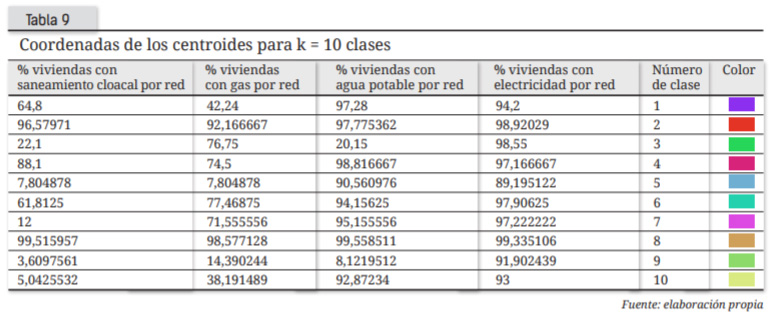 Fuente: elaboración propiaSi se continúa aumentando el número de clases, al considerar 10 clases la heterogeneidad (discontinuidad) en la periferia persiste y vuelven a aparecer discontinuidades espaciales (radios censales color rojo) en la parte urbana consolidada (radios censales color marrón claro). Se observa nuevamente una significativa proximidad entre las coordenadas de los centroides de las clases 2 y 8 (tabla 9), lo que explica la aparición de algunos radios censales (rojos) dentro del área urbana consolidada (radios censales color marrón claro).