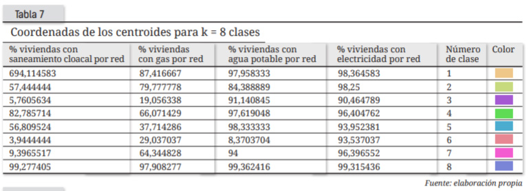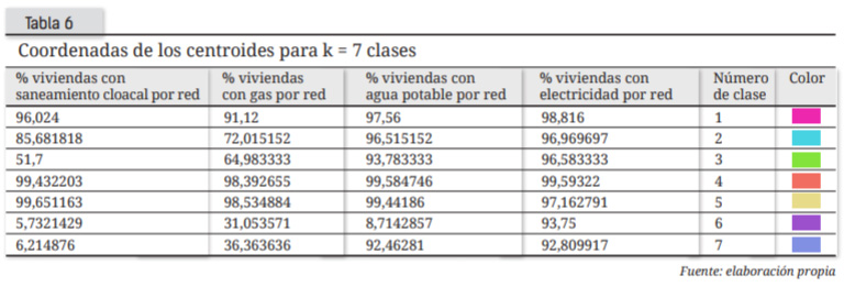 Fuente: elaboración propiaSe observa que la clase 3 de la tabla 5 se corresponde con un área que presenta continuidad espacial y alta cobertura en cada uno de los servicios. No obstante, parte de la continuidad espacial se pierde al agregar una nueva clase. Esto se ve en la tabla 6, donde se puede apreciar que las coordenadas de los centroides de las clases 4 y 5 están muy próximas entre sí y ambas clases presentan altas coberturas en cada uno de los servicios. Por lo tanto, la adición de la nueva clase (la séptima) no produjo una diferencia notoria (en cuanto a coordenadas del centroide) respecto del resto, por lo que no se justifica su existencia. En consecuencia, considerando que se desea detectar áreas con la mayor homogeneidad posible, es preferible tener seis clases en lugar de siete.