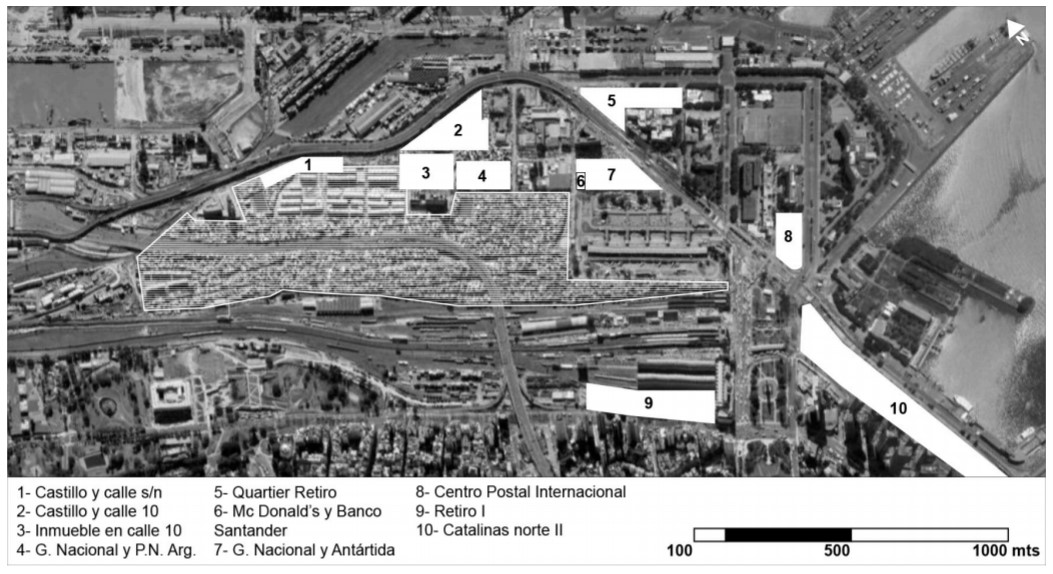 Si bien las condiciones económico-políticas han cambiado, es necesario comprender que las transformaciones impuestas por el patrón industrialista persisten como huellas en la ciudad. Correa (1993, p. 2) identifica una “sincronía entre el emerger del capitalismo en su fase plenamente industrial y el surgimiento del área central”. Los centros se configuraron a partir de su capacidad de albergar un conjunto de actividades diversas en un lugar accesible. Retiro, a principios del siglo XX, se transforma en un territorio de ese tipo al conformarse como centro de transbordo donde se localizan gran parte de las terminales ferroviarias y como lugar neurálgico por su cercanía al puerto. En efecto, en dicho barrio se ubicaron depósitos, oficinas e industrias. En la década de 1930, un grupo de inmigrantes europeos, en su mayoría polacos que trabajaban como jornaleros en el puerto, se asentaron en tierras que hoy forman parte de la Villa 31 (Bellardi y De Paula, 1986). Con el transcurso del tiempo, las estaciones ferroviarias se deterioraron, un conjunto de depósitos y fábricas fueron abandonadas y la Villa 31 se consolidó como barrio popular. Es así como se fueron solapando los “tres aspectos de deterioro” identificados por Domínguez Roca (2005, p. 222):