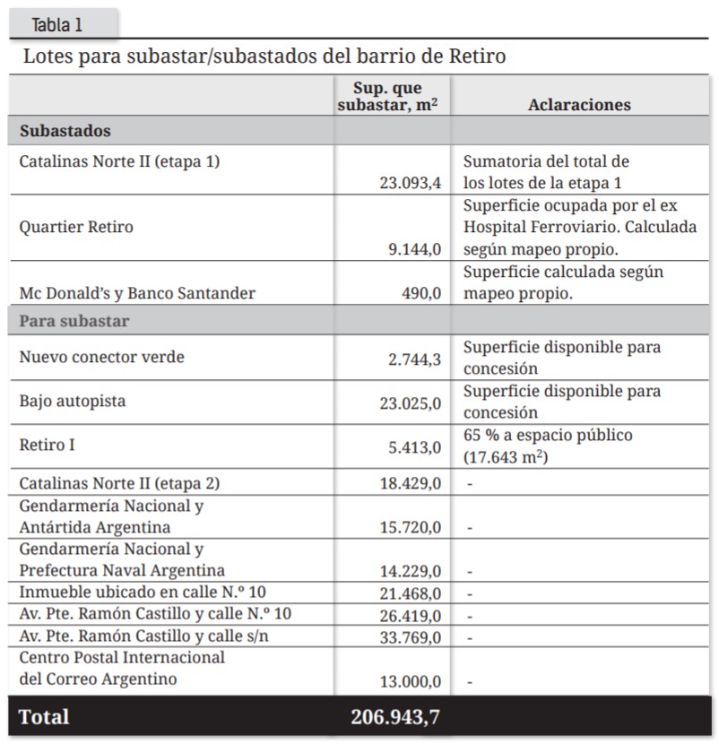 En conjunto, si a los proyectos mencionados en este subapartado les sumamos tanto aquellos predios que subastar en el marco del convenio con la CAF como las cesiones a privados que se otorgan en espacios públicos señalados en el subapartado anterior, el Estado impulsó en los últimos años la liberación de 206.943,7 m2 para el desarrollo de emprendimientos privados en el barrio de Retiro (ver tabla 1).