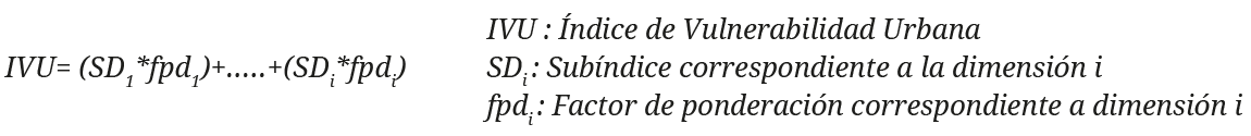El IVU constituye la síntesis de todas las dimensiones, variables e indicadores analizados. Se obtuvo en primer lugar un “subíndice” por cada dimensión, como la sumatoria del producto de cada indicador por su factor de ponderación. El índice final es la sumatoria de los valores de los subíndices de todas las dimensiones ponderadas.