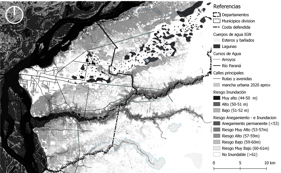 El territorio abordado es presentado sintéticamente en los mapas 1 y 28, donde se puede observar que las costas poseen un perfil topográfico que combina zonas de barrancas, tramos defendidos por obras de infraestructura (defensas o paseos costeros) o ecosistemas de bañados al norte y al sur; estos últimos dependen de los ciclos de inundación o estiaje. Por otro lado, hacia el este del territorio se distribuyen lagunas sobre lomadas arenosas y esteros, un ecosistema de gran complejidad que atraviesa el norte de la provincia (Contreras & Ojeda, 2018) y que tiene su pendiente hacia la zona sur de la ciudad de Corrientes.