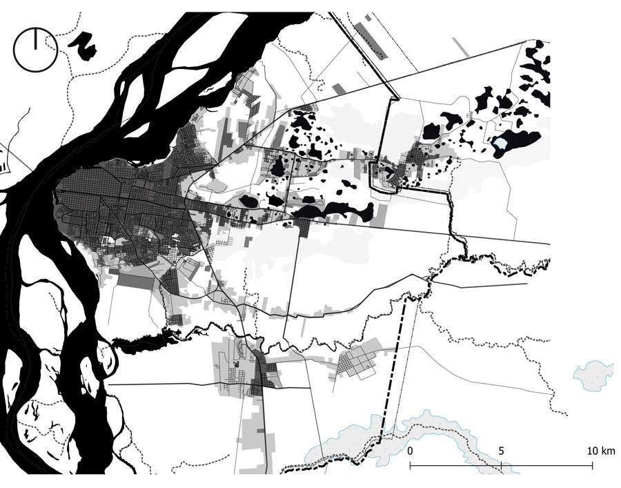 Corrientes3 es una ciudad intermedia del nordeste argentino, capital provincial fundada en la época colonial por el avance español en su estrategia colonizadora, imperialista y extractivista, que se sustentó en diversas técnicas de apropiación del territorio y disciplinamiento de los habitantes originarios. Se trata de una de las áreas urbanas más pobres del país4, y forma parte de un conjunto de centros urbanos de la región sudamericana conocida como la Cuenca del Plata. En esta, son características las crecientes periódicas y extraordinarias de los ríos5, como el río Paraná, en torno al cual se funda Corrientes. A su vez, la región posee regímenes pluviales de clima subtropical (1000 a 1500 mm anuales) y una topografía de llanura6 con pendientes mínimas. El área de estudio se ubica en la región del Paraná Medio y se encuentra determinada por ciclos hídricos7 que varían entre crecidas y momentos de estiaje (Snaider & Ramírez, 2018) y por el agua que escurre en el territorio, a partir de las lluvias y las posibilidades de drenaje.