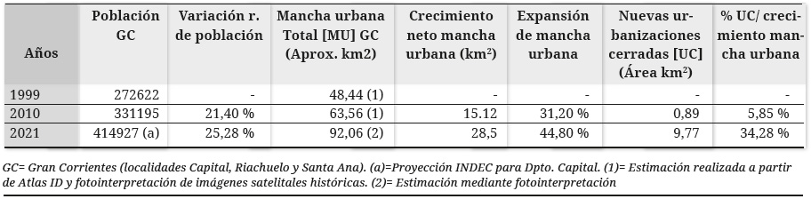 Fuente: elaboración propia sobre la base de recursos de: OSM, IGN y Municipalidad de Corrientes (MC); 2020El área comprendida como el Gran Corrientes está conformada por las localidades de Corrientes Capital, Riachuelo y Santa Ana. La capital ha tenido un crecimiento exponencial de población a partir de los años 50 (Foschiatti & Bolsi, 1993), y a partir de los 90 un proceso de movilidad residencial hacia localidades próximas, que produjo una relación metropolitana de “expansión dispersa” o “incipiente” (Alberto et al. , 2018). A su vez, a partir de los 90 existe una tendencia a mayor extensión de la mancha urbana en relación con el aumento de población, que implica formas de dispersión9 (tabla 1 y mapa 3).