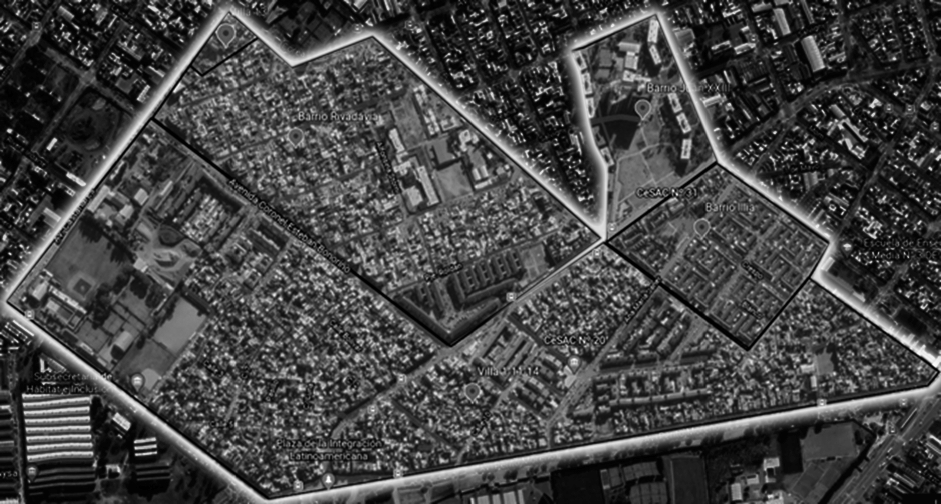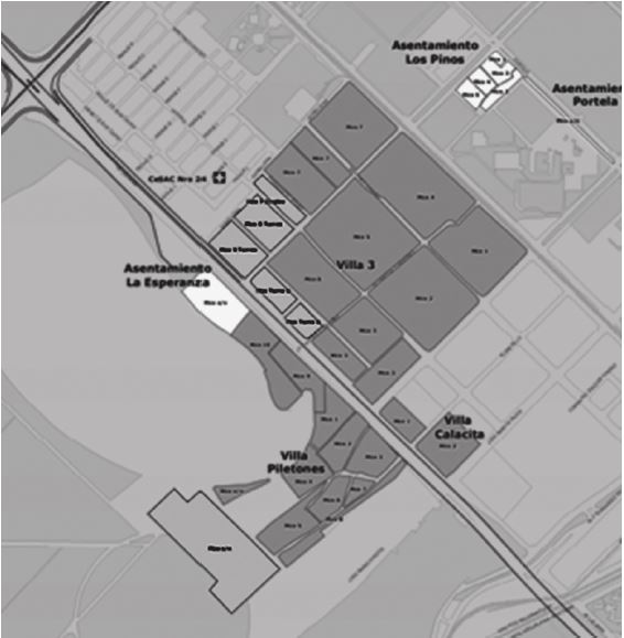 Más allá de la importancia del criterio “de oportunidad” y el empleo de una estrategia de “bola de nieve” para garantizar el acceso a instancias de observación y entrevistas, cabe señalar que limité la ubicación de estas a dos contextos geográficos de indagación específicos. La selección de ambos territorios respondió a una estrategia de muestreo dirigido. Se trata de dos espacios en los que Gendarmería se ha mantenido operativa de forma ininterrumpida desde 2011, lo que permite realizar una lectura diacrónica. Además, uno de los barrios era considerado como el más “tranquilo” por la fuerza, mientras que el otro era identificado como el más “peligroso”. Esta distinción me permitía comparar modalidades diferenciales de despliegue y actividad que se llevaron a cabo en distintos contextos. Para delimitar las zonas geográficas tomé como criterio la “zona de responsabilidad” de dos “Unidades de Prevención Barrial” de Gendarmería, esto es, las divisiones de la fuerza abocadas específicamente a los barrios populares informales. En primer lugar, la “UPB 1-11-14”, cuya jurisdicción alcanzaba no solo a la propia villa “Padre Rodolfo Ricciardelli” (ex 1-11-14), sino también a los complejos habitacionales “Illia”, “Rivadavia I”, “Rivadavia II” y “Juan XXIII”.