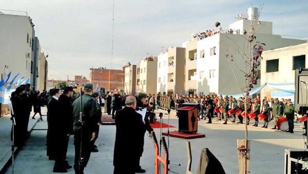 Fuente: elaboración propiaLa gendarmería se disponía frente a un amplio escenario. En el centro, se aprestaba la orquesta de la fuerza. Un gendarme iba guiando la ceremonia con órdenes relativas a la posición y el saludo. Al mismo tiempo, un locutor anunciaba los distintos momentos del acto, que combinaban discursos, himnos y movimientos militares. Hablaron el propio locutor, el capellán de la fuerza y el jefe del despliegue de Gendarmería en CABA. Se cantaron a viva voz dos himnos de la fuerza: el recitado “Decálogo del Gendarme Argentino” y la canción “Águilas de las fronteras”. Durante el acto, muy pocos vecinos se acercaron; mayormente, iban apareciendo espectadores en las ventanas y balcones de los edificios.