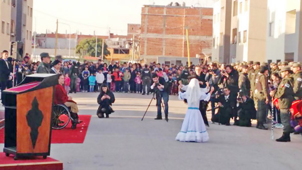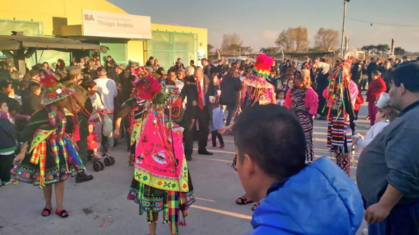 Terminada esta ceremonia, empezó la segunda parte: la “comunitaria”. Estaba compuesta completamente por números artísticos. Primero, una pareja de niños disfrazados con ropas de época que bailaron un “gato” (danza folclórica argentina). A continuación, dos bailarines adultos interpretaron primero el “Tango Ilimani” (canción que, a pesar de ser un tango, era de origen boliviano) y luego, una “morenada” (danza típica del altiplano, Bolivia, Perú, y el noroeste argentino). Alrededor, el público se fue incrementando notablemente a medida que pasaban los números. Algunos vecinos hacían palmas. Otros observaban atentos, varios de ellos con niños. Algunos se animaban a esbozar bailes. De pie en el escenario, apareció flameando la bandera de los pueblos originarios andinos, la Wiphala. La música del último número sonaba más típicamente “andina”, con sikus y quenas.