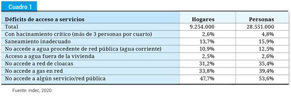 Los procesos enunciados dan lugar a los problemas de acceso al suelo por parte de los sectores populares y a las condiciones deficitarias del hábitat y la vivienda. Por caso, el relevamiento de la Encuesta Permanente de Hogares (EPH) en los principales aglomerados urbanos de Argentina arroja para el segundo semestre de 2020 que más de 28.000.000 de personas nucleadas en más de 9.000.000 de hogares sufren algún tipo de déficit en cuanto acceso a los servicios. Como se puede ver en el cuadro 1, los mayores déficits refieren al acceso a la red cloacal y a la red de gas. Asimismo, de estos datos que refieren a treinta y un aglomerados urbanos, se desprende que 1.382.000 personas viven en hacinamiento crítico, 940.000 hogares no acceden al agua de red pública y en más de 230.000 hogares la disponibilidad de agua es fuera de la vivienda.