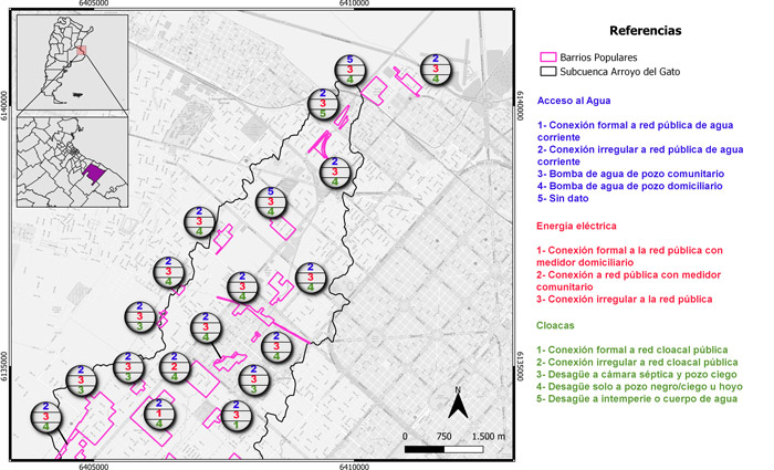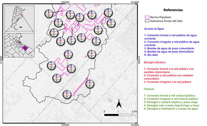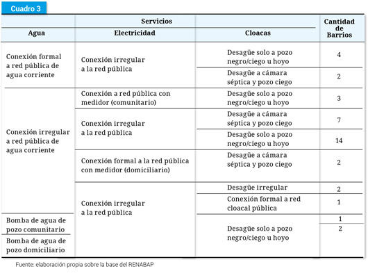 Una aproximación a la precariedad de estos barrios es a través de su accesibilidad a redes y servicios. Según el RENABAP, la mayoría de estos adquieren energía eléctrica y agua a través de conexiones irregulares a las redes públicas (87.8 % y 73.2 % del total de barrios, respectivamente). En lo que refiere a los residuos cloacales, un único barrio cuenta con conexión formal a la red, predominando el desagüe a pozo ciego u hoyo (65.9 % del total de barrios). En el cuadro 3 los barrios fueron agrupados según la combinación de accesibilidad a estos servicios. Cabe destacar que, en el agrupamiento realizado, tres barrios no fueron contabilizados, ya que no se cuenta con información respecto de uno o más de los servicios.