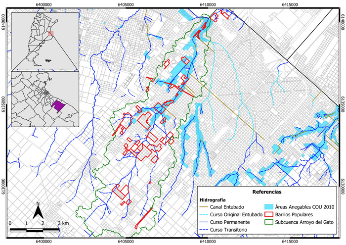 La cuenca se divide en tres subcuencas: la del arroyo Regimiento, la del arroyo Pérez y la del arroyo Del Gato propiamente dicha, objeto esta última del presente estudio. En ella se localizan 41 barrios populares habitados por 8000 familias (RENABAP, 2018), muchos de los cuales se encuentran en zonas anegables, próximos al curso de agua principal y sus afluentes. La localización de estos se concentraba en las décadas de 1980 y 1990 en las cuencas baja y media, mientras que a partir de la década de 2000 las ocupaciones se extendieron a la cuenca alta de dicho arroyo (Del Río y González, 2018).