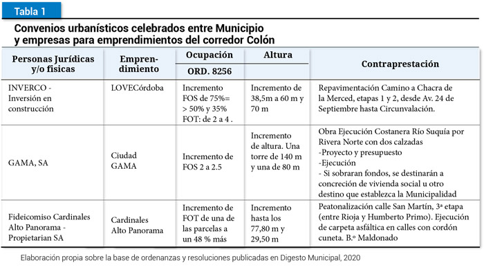 En el caso del Corredor Colón, la Ordenanza N.º 8256 lo define como “Zona de conformación lineal que afecta las parcelas y/o manzanas con frente a determinadas vías” (p. 3). En la Ordenanza N.° 10.006, promulgada en el año 1998, se incorpora parte de la avenida Colón como área especial, desde la avenida Zípoli al este, hasta su intersección con avenida Cárcano, al oeste, sumada también a la avenida Duarte Quirós. Dicha ordenanza establece formas e intensidades de ocupación del corredor por tramos; principalmente se tendió a una ocupación del suelo del 50 % al 70 % (dependiendo del tramo), factores de ocupación total por encima de 2, altura entre 12 a 21 m, y en algunos casos esta se superó hasta los 80 pisos, previo acuerdo con la Municipalidad. Dichos acuerdos se celebraban con la emisión de resoluciones y decretos especiales, pero en 2012 mediante la ordenanza N.° 12.077, denominada Convenios Urbanísticos, se regularon formalmente. De esta manera, el Estado adquirió la potestad de adecuar o flexibilizar la normativa vigente según los requerimientos de las empresas inmobiliarias, recibiendo a cambio un beneficio económico, comúnmente materializado en obras. En el caso del corredor Colón, se celebraron tres convenios urbanísticos: el primero se dirimió entre el grupo GAMA y la Municipalidad de Córdoba para la instalación del proyecto Ciudad GAMA en una parcela de dieciséis hectáreas. El segundo, con el emprendimiento Love Córdoba, en un predio de 2,5 hectáreas, y el tercero, con GNI para el emprendimiento Cardinales Alto Panorama. En los diferentes casos se apuntó al aumento de indicadores urbanos (altura, intensidad edificatoria, FOS, FOT), a cambio de contraprestaciones ejecutadas en obras de infraestructura urbana (tabla 1). Si bien estos tienen como objetivo el “desarrollo urbano” en conjunto con las acciones privadas inmobiliarias a través de obligaciones económicas, estas no equiparan las ganancias de los promotores y en algunos casos los efectos urbanos y sociales, como el aumento en los precios de suelo y vivienda.