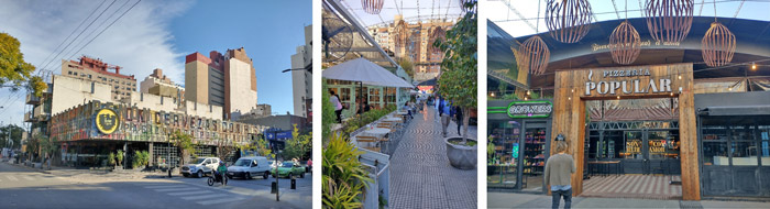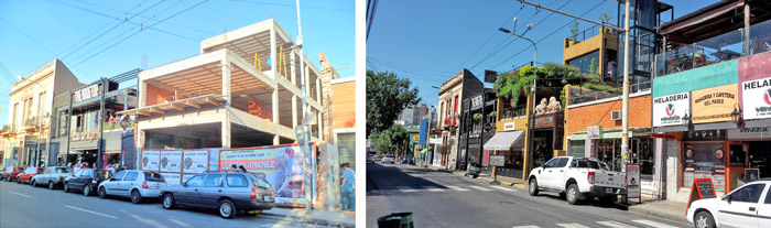 Elaboración propia, 2022. Fuente: Catastro de la Provincia de Córdoba, 2022El barrio Güemes6 forma parte de los barrios tradicionales de Córdoba; estos fueron las primeras expansiones urbanas que carecieron de una efectiva planificación estatal y/o privada (Boixadós, 2000). Previamente a su constitución, estaba conformado y dividido por cuatro fracciones denominadas La Bomba, el Infiernillo, Pueblo Nuevo y El Abrojal, localizables en el territorio hasta principios del siglo XX. Actualmente está ubicado en el área central al sudeste, a 200 metros del centro histórico de la ciudad. Esta área fue sistemáticamente intervenida a través de diversos proyectos urbanos. Por ejemplo el plan “Portal Güemes” (2009)7 buscó convertir esta sección en un “corredor cultural similar al de San Telmo (en Buenos Aires) para contemplar negocios de artesanías, antigüedades y galerías de arte”8 (La Voz del Interior, 31/8/2008). En este marco, reaparecieron ciertas nominaciones referidas al espacio: “obsoleto”, “abandonado”, en “desuso”, que operan como argumento suficiente para intervenir el territorio y permitir, por ejemplo, la reconversión de estacionamientos de autos y viejas gomerías en galerías comerciales “sustentables”9. A su vez, esta imagen reciclada posicionó al sector popularmente y se convirtió en uno de los más visitados por su impronta característica de innovación, bohemia, lo hippie y chic. Desde las figuras oficiales, los funcionarios públicos y el diario de mayor tirada en Córdoba “La Voz del Interior” lo definieron como un espacio de disfrute y de paseo para el turista. Como síntoma emergieron comercios que comenzaron a instalarse en el área más concurrida: se habilitaron 485 negocios entre los años 2013 y 2019, siendo el rubro gastronómico el que más creció. En consecuencia, la imagen arquitectónica se transformó con comercios con espacios exteriores e intermedios, como terrazas, balcones, aparecieron galerías con recorridos internos dentro de la manzanas, se observa un aumento de la altura respecto de la tradicional, el uso de grandes espacios vidriados, entre otros (figura 3). El auge del sector aceleró la aparición en 2019 de un emprendimiento inmobiliario con tres torres de viviendas y un mall comercial (en total se trata de 945 departamentos, 250 locales comerciales, 120 unidades corporativas y 750 lugares para estacionamiento) denominado Pocito Social Life, desarrollado por la empresa PROACO, SA.