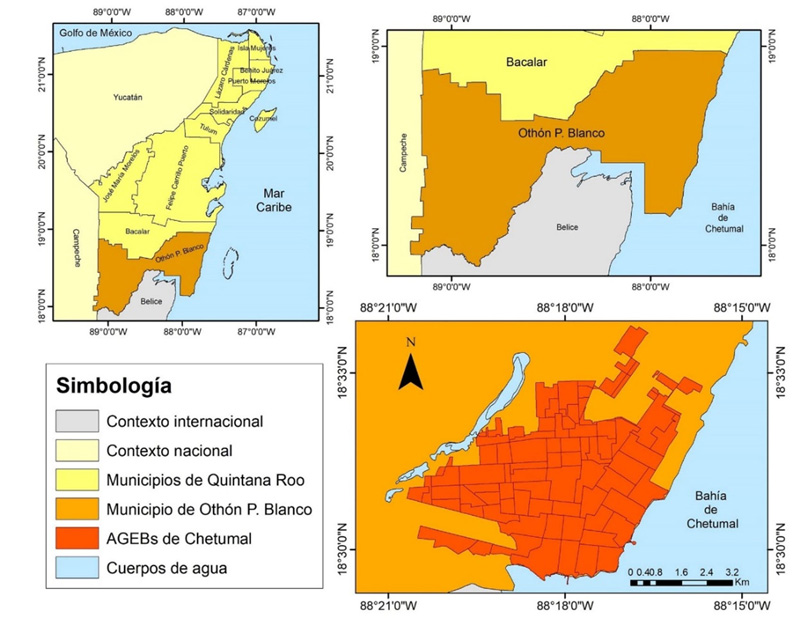 La aplicación de la encuesta se llevó a cabo en la ciudad de Chetumal, municipio de Othón P. Blanco, ubicado en el estado de Quintana Roo, específicamente en la porción sureste del territorio, que comprende la República Mexicana, entre los paralelos 18°30′50″ latitud norte y los meridianos 88°18′13″ longitud oeste (figura 1). El área de estudio tiene una población de 161.389 habitantes, de acuerdo con los datos intercensales reportados por el Instituto Nacional de Estadística y Geografía (Inegi, 2016).