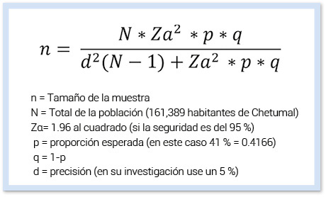 A través de la prueba piloto se obtuvo la proporción esperada de la población de Chetumal que gestiona sus residuos sólidos urbanos, que arrojó el dato de 0.4166, por lo cual se seleccionó para el cálculo de la muestra la fórmula de poblaciones finitas. Cuando el universo es finito, es decir, contable, y la variable de tipo categórica, primero se debe conocer “N”, o sea, el número total de casos esperados o que ha habido en años anteriores (Herrera, 2011).
