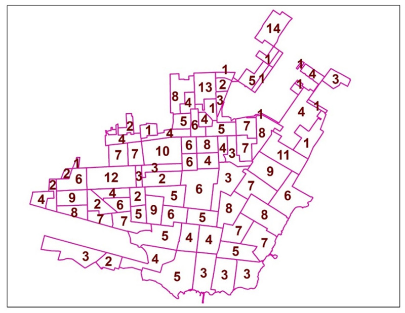 Elaboración propia con base en Inegi (2010)La selección de los hogares en las manzanas elegidas se hizo de forma sistemática, tomando en cuenta las casas ubicadas en las esquinas, empezando desde el noroeste de la manzana, continuando del lado derecho en cada esquina. Si la casa de la esquina que encuestar no estaba o no hubiera casa, se reemplazó la de lado derecho, y así sucesivamente. Sin embargo, en el caso de tener que realizar cinco encuestas en una manzana, se encuestó la tercera casa a partir de la primera casa encuestada.