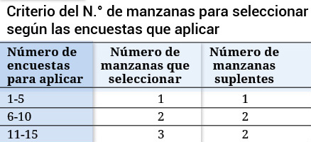 Criterio del No de manzanas a seleccionar según las encuestas que aplicar