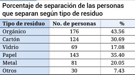 Elaboración propia (2019)Después de analizar los datos, se encontró que la gran mayoría (el 95 %) de la población encuestada entrega sus residuos al camión recolector. De aquellos que entregan sus residuos, se identificó que el 59 % realiza algún tipo de separación, ya sea total o parcial (6 % y 53 %, respectivamente). En cuanto a los tipos de residuos más separados, se observó que el orgánico es el más separado, seguido del papel y el cartón (tabla 3).