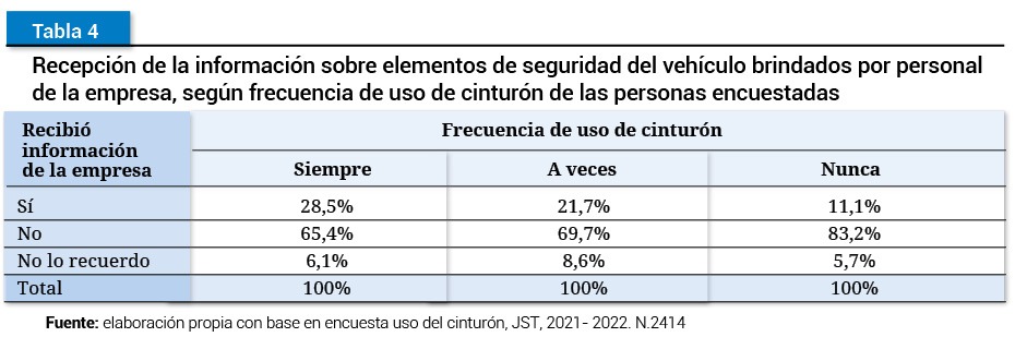 Fuente: elaboración propia con base en encuesta uso del cinturón, JST, 2021- 2022. N.2414Este resultado podría explicar que entre las personas que declaran usarlo existe una disposición a recibir esa información y, por ende, a estar más atentas. También se podría pensar que este resultado apoya la utilidad de que las empresas lleven adelante el protocolo de seguridad, es decir, al parecer, cuando la información de seguridad está disponible, las personas usan más el cinturón.