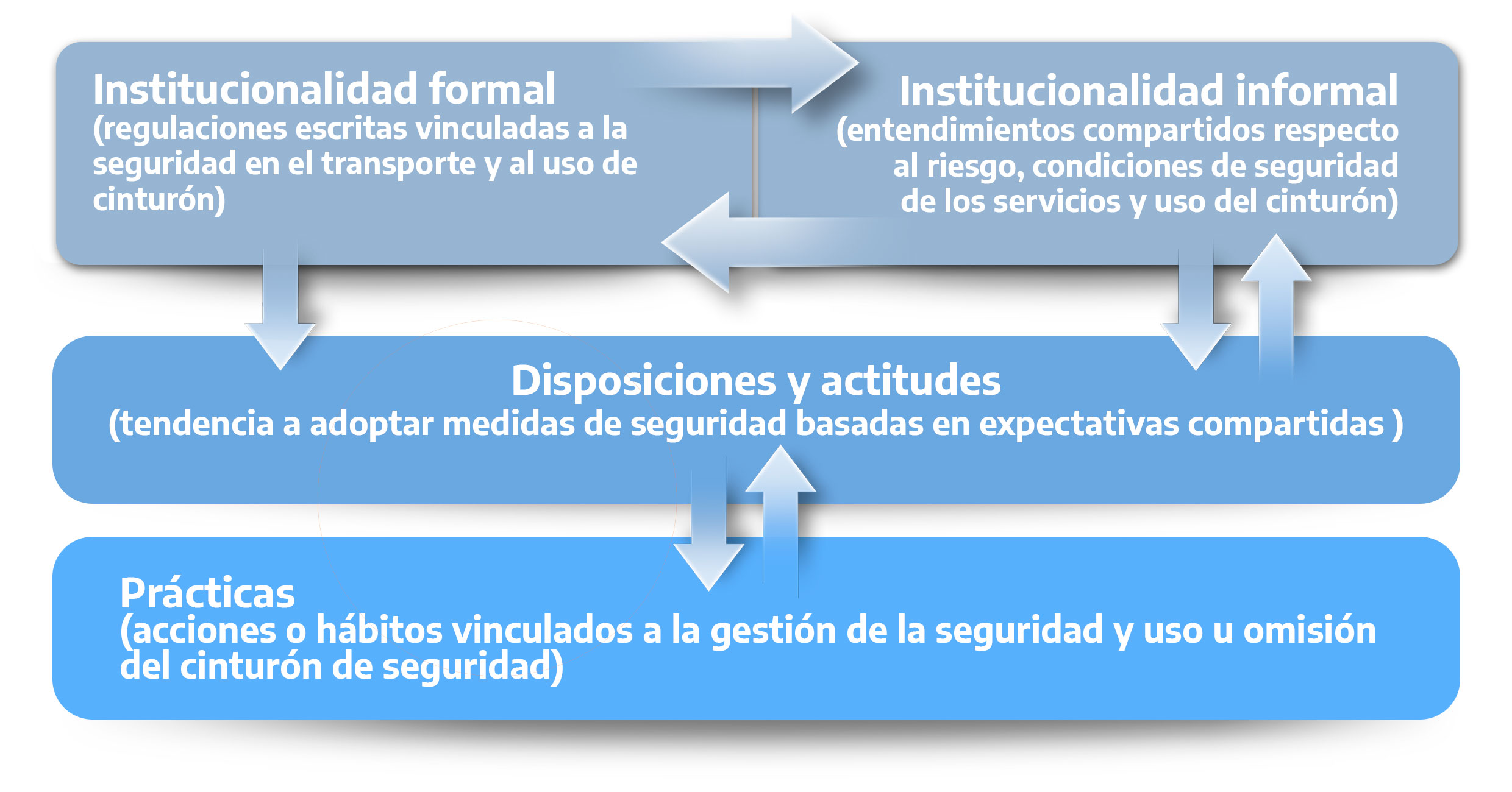 El resultado de la interacción entre la institucionalidad formal e informal configura la cultura de la seguridad operacional, a partir de la cual se modelan las disposiciones y actitudes. Estas pueden estar presentes en hábitos incorporados de seguridad y cuidado o manifestarse en una evaluación racional entre riesgos y beneficios (Simsekoglu & Lajunen, 2008; Aberg, 2001; Furian et al., 2021). Un elemento importante que se conforma a partir de la interacción de la institucionalidad formal e informal es la percepción del riesgo, que se refiere al sentimiento de seguridad/inseguridad en el transporte en relación con el miedo de las personas a verse involucradas en un accidente (Hyden, 2016). En este sentido, es una disposición constituida por una gran variedad de aspectos internos y externos, como la experiencia personal, la observación e interpretación de las situaciones de tránsito, las normas sociales, los rasgos de personalidad, el nivel de información, las características de la infraestructura y los vehículos, entre otros. También, el riesgo percibido interviene en la evaluación de beneficios y barreras existentes para adoptar comportamientos de cuidado. En este sentido, las disposiciones y actitudes son una parte sustantiva de la forma que asumen las prácticas: en este caso, aquellas relacionadas con la gestión de la seguridad mediante el uso de cinturón de seguridad.