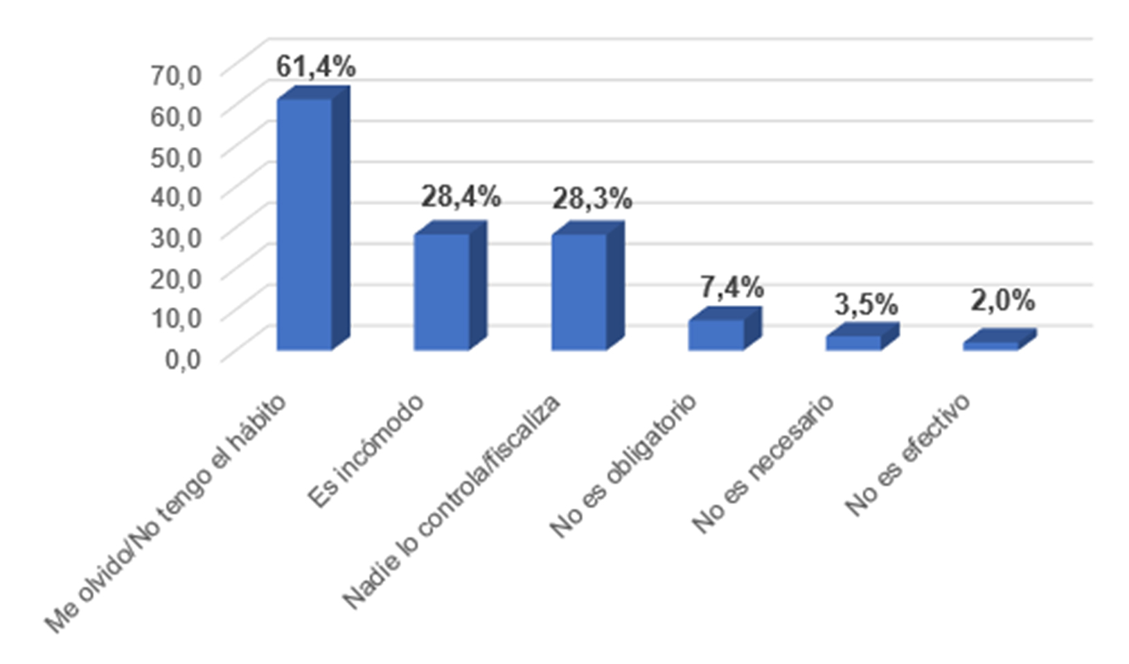 Fuente: elaboración propia con base encuesta uso del cinturón, JST, 2021- 2022. N.2414Al explorar con mayor profundidad las razones por las cuales aquellos que participaron de la encuesta no utilizan siempre el cinturón de seguridad, la mayoría argumentó olvidarse o no tener el hábito de hacerlo (61 %). En menor medida indicaron que el dispositivo de retención les resulta incómodo (28 %) y que ningún operador supervisa que lo tengan colocado al viajar (28 %). Marginalmente, las personas encuestadas respondieron que el cinturón de seguridad no es obligatorio (7,4 %), no es necesario (3,5 %) y no es efectivo (2 %). La baja frecuencia de estas últimas dos razones colabora en desestimar que los motivos para no utilizar el cinturón de seguridad estén sustentados en percepciones negativas sobre su funcionalidad y efectividad para disminuir riesgos al viajar. Es menester destacar que al consultarles por este tema las y los encuestadas/os podían seleccionar varias opciones. Esta es la razón por la que, agregadas las categorías descriptas, superan el 100 %, al calcularse sobre el total de casos (gráfico 2).