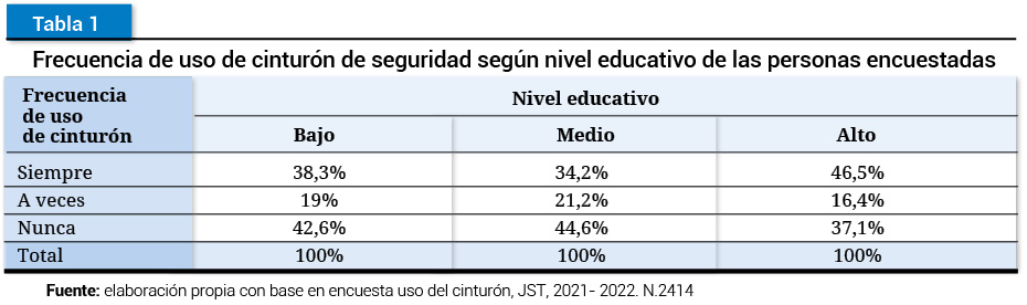 Fuente: elaboración propia con base en encuesta uso del cinturón, JST, 2021- 2022. N.2414Además del nivel educativo y la edad, se analizaron las distintas dimensiones según el género informado por las personas encuestadas. Sin embargo, no se registraron variaciones que se consideren relevantes.