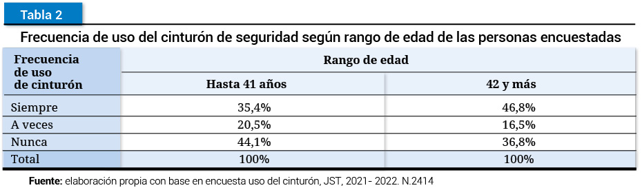 Fuente: elaboración propia con base en encuesta uso del cinturón, JST, 2021- 2022. N.2414