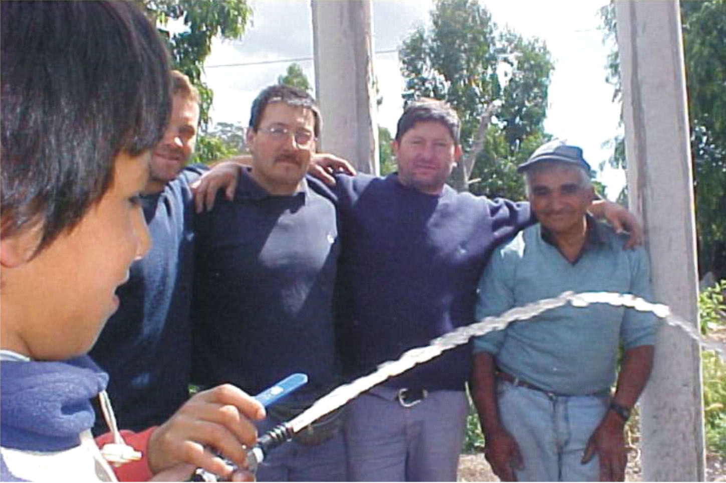 Técnicos y profesionales de OSSE conectaron los tanques y colocaron una bomba subterránea (ver serie foto 1, b-estructura y conexión de tanques). Finalmente, la inauguración del abrazo de los técnicos de OSSE con Farías. Farías a la derecha con gorra, con un niño que abre el primer chorro de agua (foto 2).
