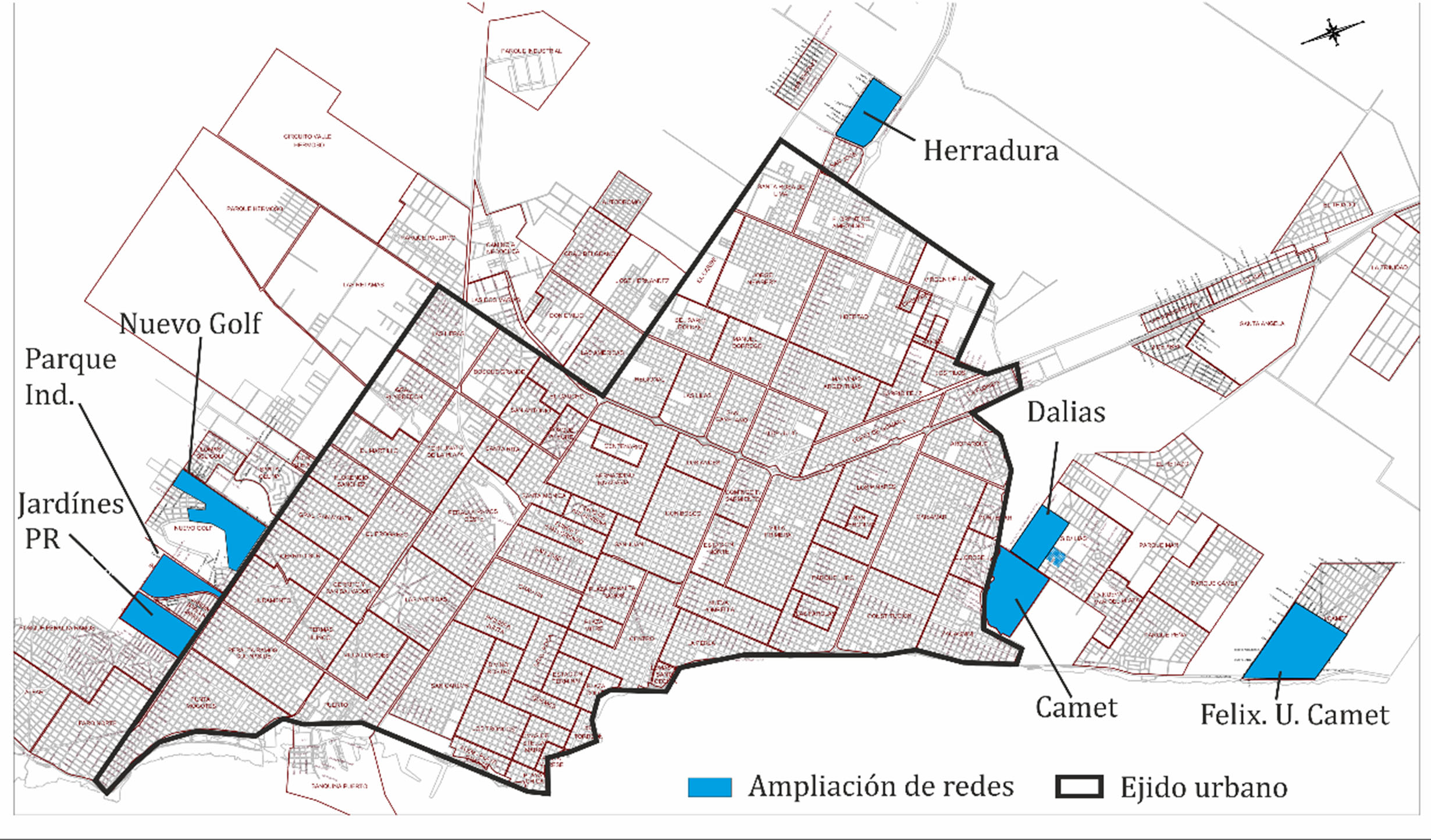 En el Partido de General Pueyrredon entre 2008 y 2015 se ejecutaron en la ciudad 103.915 metros de cañerías (tabla 1) y 5034 hogares, en siete barrios que no contaban con servicio, situados todos fuera del ejido urbano (plano 3) (Ispizúa, 2023).