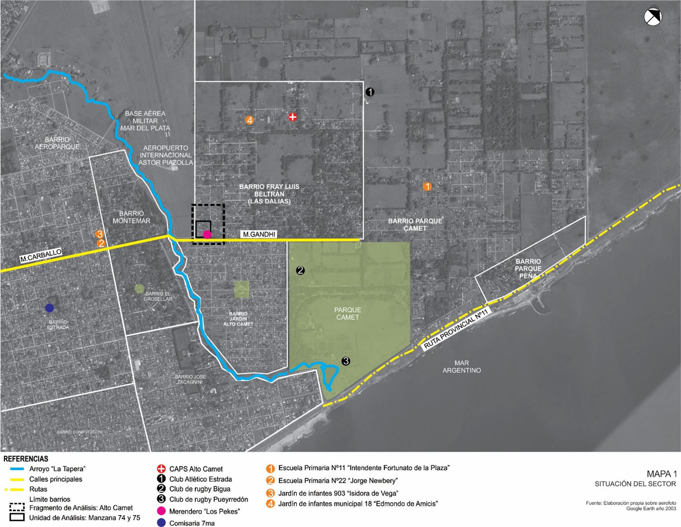 Elaboración propia sobre aerofoto Google Earth, año 2003Si bien estos contrastes y adyacencias entre barrios cerrados y asentamientos precarios no constituyen una observación novedosa, me interesa señalar algunos aspectos de esta complejidad. Por un lado, la presencia de equipamiento público, como el aeropuerto, el Parque Camet, un centro deportivo inconcluso y la escuela N.º 11. Luego, la avenida Gandhi, que vincula la ciudad con el parque público y la zona norte, esta última también de ocupación diversa, como el barrio denominado Las Dalias, centro de salud e iglesia evangélicos. Más lejano, el Club barrial deportivo Estrada, sobre la calle San Francisco de Asís, donde concurren muchos niños y jóvenes del sector del asentamiento. En conjunto forman parte de la territorialidad de la población del sector más crítico del asentamiento. Este pequeño fragmento es uno de los espacios de partido que manifiesta en forma más extrema contrastes tan próximos y una extrema fragmentación y desigualdad.