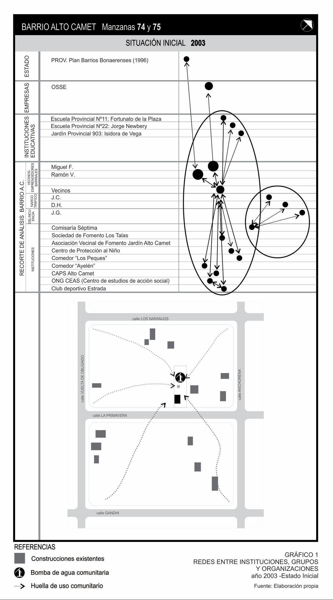 En relación con la situación precaria del sector, la única presencia del estado municipal ha sido a través de Obras Sanitarias Sociedad de Estado (en adelante OSSE), a partir de la instalación de una bomba de agua para uso comunitario en el centro de la manzana (gráfico 1).