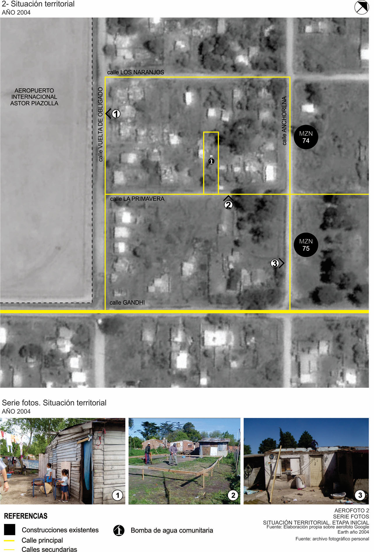 Elaboración propia sobre aerofoto Google Earth año 2004 y archivo fotográfico personalEl área de asentamiento está constituida por ocho hectáreas próximas a la avenida Gandhi. Todo este sector carecía de agua corriente, cloacas y de red eléctrica formal. De escasa densidad, no existía una estructura formal urbana respecto de división y uso de la manzana, tal como lo testimonian las huellas de uso público en el terreno, marcas de recorridos internos de una calle a otra, la mayoría conducentes a la bomba de agua comunitaria (plano en gráfico 1).