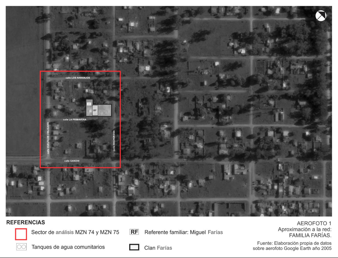 Elaboración propia de datos sobre aerofoto Google Earth, año 2005Esa acción concreta anunciaba su proyección comunitaria. Farías se constituiría en centro de un desarrollo colectivo para instalar dos tanques comunitarios y una red de agua domiciliara en carácter precario. En las distintas instancias de la trayectoria de este desarrollo, tanto de gestión institucional, en las vinculaciones técnicas con los profesionales de OSSE, como en el liderazgo con los vecinos, Farías fue protagonista y partícipe activo de cada decisión.