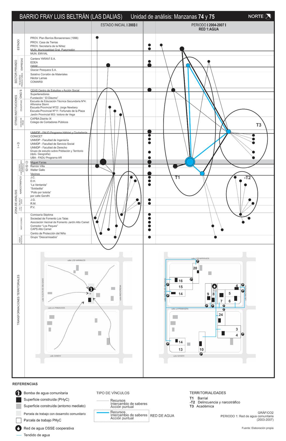 El gráfico 1 (primera columna) muestra una aproximación de las redes instaladas en la situación inicial de esta experiencia. También en el mapa de situación inicial del gráfico 1, el acercamiento a partir de la red de agua permitió conocimiento sobre la forma de ocupación de las manzanas en clanes familiares: Villa (parcelas 3 y 4, mzna. 75 y 9 de la mzna. 74), Farías (parcelas 5, 6, 7 y 8, mzna. 75), Rios (parcelas 14 y 16, mzna. 74) y Etchegaray (parcelas 13 y 14, mzna. 74).