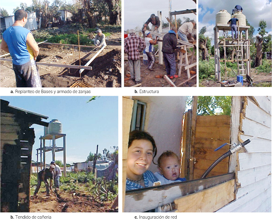 Archivo fotográfico propioLa construcción colectiva de los tanques se desarrolló con una espontánea colaboración y articulación de saberes profesionales y técnicos con idóneos de la cultura material popular. Ingenieros del entonces Programa Hábitat de la MGP, además de los materiales, aportaron detalles y cálculos de la estructura de hormigón; profesionales y técnicos del PHyC y de OSSE trabajaron en forma cooperativa con idóneos del barrio (serie fotos 1 a-replanteo). Se puede ver a Carlos Farías, al fondo, inclinado atando el hilo para marcar las columnas, y de espaldas a Oscar “Tarzán”, quienes fueron parte del grupo de vecinos que sostuvieron la iniciativa barrial. En un marco de autoconstrucción asistida, con la coordinación comunitaria de Miguel Farías, este proceso ha tenido un considerable impacto, hacia dentro, en la historia de este asentamiento (serie foto 1, b-estructura) y hacia afuera, tanto en la difusión como en lo institucional.