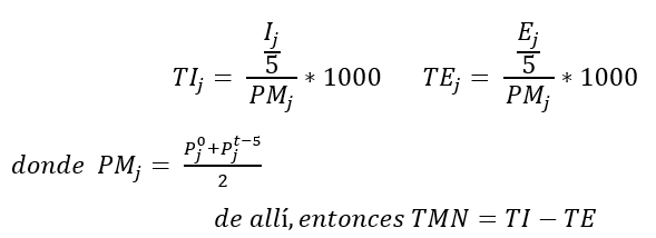 Para medir la suburbanización de las clases altas utilizaremos la denominada tasa de migración neta (TMN) de jefes y jefas de hogar con estudios superiores completos. Para las distintas subdivisiones geográficas de un país, la TMN se calcula como la diferencia entre las tasas (T) de inmigración (I) y emigración (E). Este saldo es normalizado según la cantidad de años transcurridos entre el censo (t0) y el año de referencia anterior (t-5) y la población media (PM) de la subdivisión geográfica a lo largo del período.