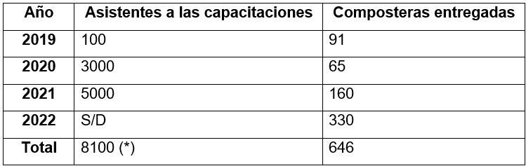 Asistentes a capacitaciones y composteras entregadas en Vicente López (2019-2022).