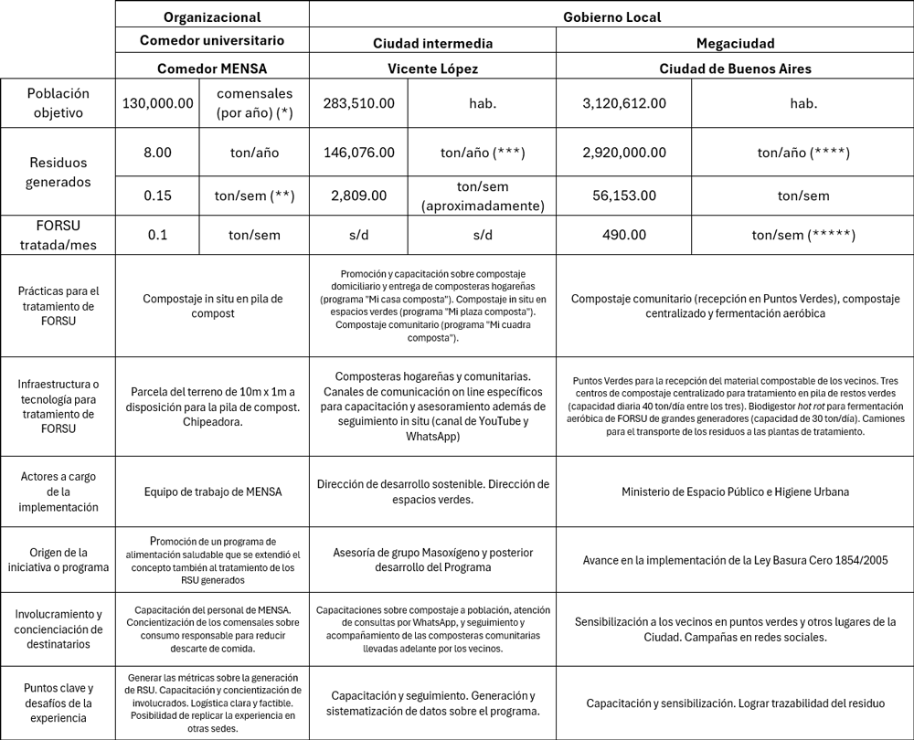Las diversas experiencias señaladas fomentan el tratamiento tanto de la Forsu por separado o, en ocasiones, junto con los llamados restos verdes. En ellas se pueden observar iniciativas de tratamiento de la Forsu de distinta escala y también distinto tipo: el compostaje hogareño o in situ, el compostaje comunitario o descentralizado, el compostaje centralizado a través de pilas de compost y la fermentación aeróbica. La Tabla 2 muestra una comparación de las tres experiencias en base a población objetivo, residuos generados en cada caso, Forsu tratada por mes, prácticas para el tratamiento de FORSU, infraestructura o tecnología para tratamiento de Forsu , actores a cargo de la implementación, origen de la iniciativa o programa, involucramiento y concientización de destinatarios, y puntos clave y desafíos de cada experiencia.