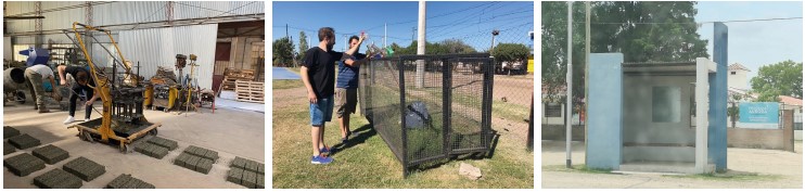 Se construyeron prototipos demostrativos con componentes elaborados en el instituto en varios de los municipios, que también aportaron fondos o materiales, a saber: en el Municipio de Las Varillas se construyó el mobiliario urbano de una plaza y un “punto limpio” para recolección de residuos con paredes de ladrillos de PET reciclado, pisos con tablas de plásticos varios reciclados y ventanas de hormigón fabricadas con agregados de RAEE reciclados (Figuras 6 y 7).